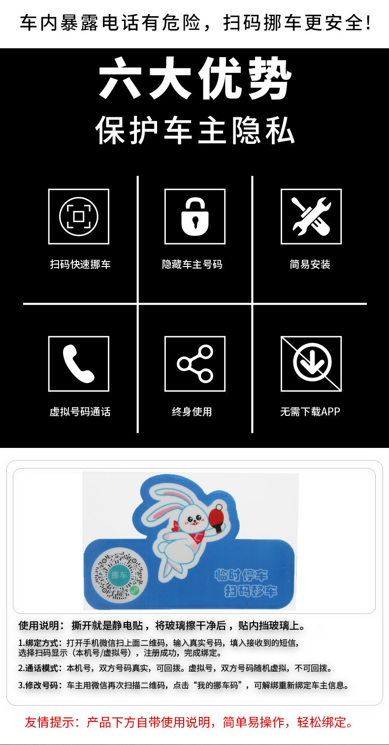 使用原理:微信掃碼通知車主移車,或通過(guò)虛擬號(hào)碼撥打車主電話,保護(hù)車主信息免泄露免打擾。